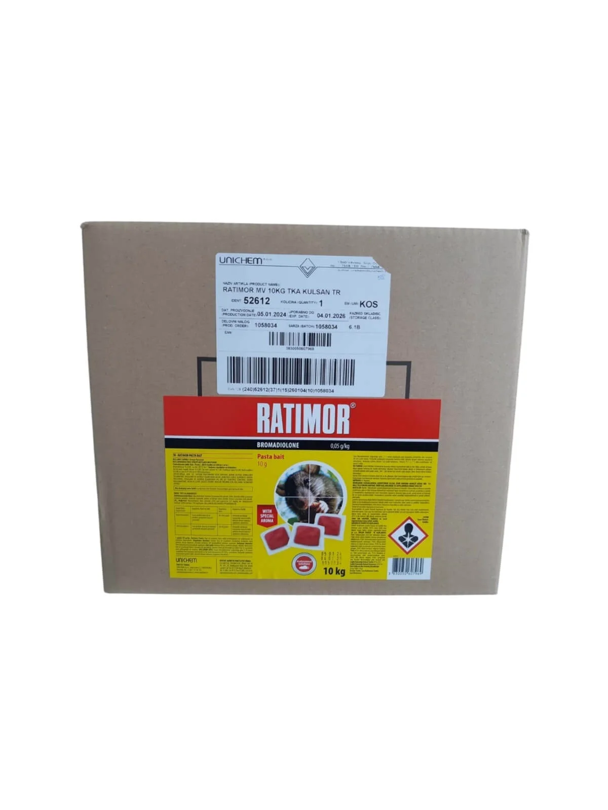 İçeriğinde Bromadiolone %0,005 bulunur. Kulsan Ratimor Pasta Bait, farelere karşı etkili bir yem formunda rodentisittir. 10 Kg ambalajı ile büyük alanlarda ve yoğun fare sorunlarında kullanım için uygundur. Pasta formu sayesinde fareler ürünü kolayca tüketir ve hızlı sonuç elde edilir.